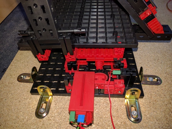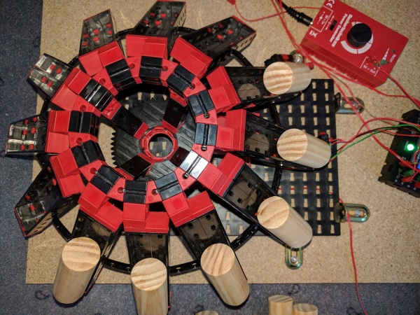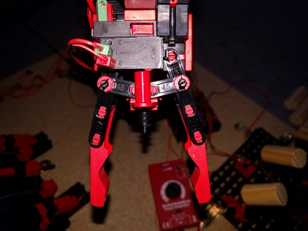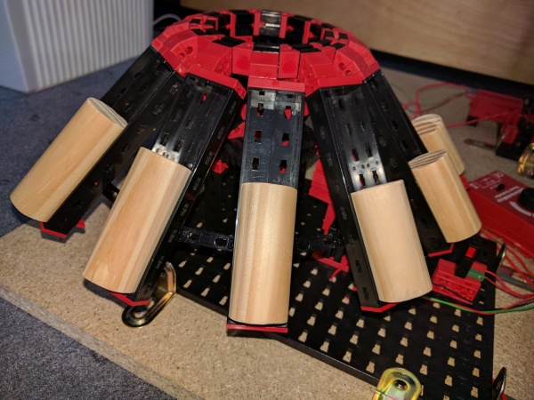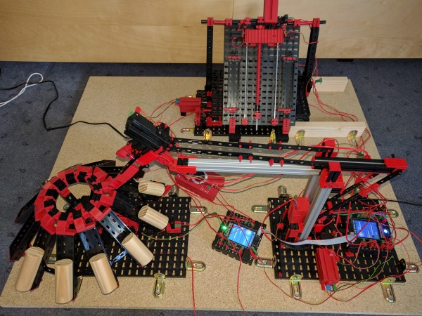 Die Fotos zeigen die ft-Sortiermaschine, die unabhängig vom konkreten Algorithmus konzipiert ist. Sie kann bis zu 12 Holz-Zylinder in einem Drehkarussel aufnehmen. Per Greifarm können zwei Elemente zu einem Vergleichstisch transportiert und dort in ihrer Länge verglichen werden. Der Vorgang ist zeitaufwändig! Für 12 Elemente braucht Bubblesort ca. 140 Minuten. Deshalb zeigen die Videos auch nur das Sortieren von 6 Elementen.